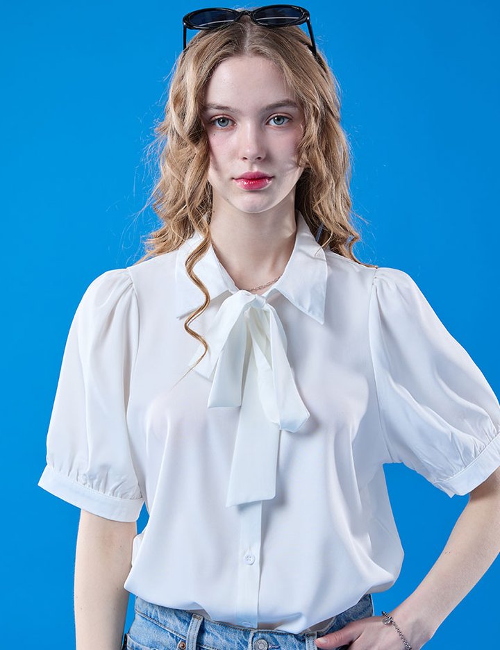 [콜릿] 퍼프 리본 타이 셔츠 에어 반팔 블라우스 (WHITE) KCL