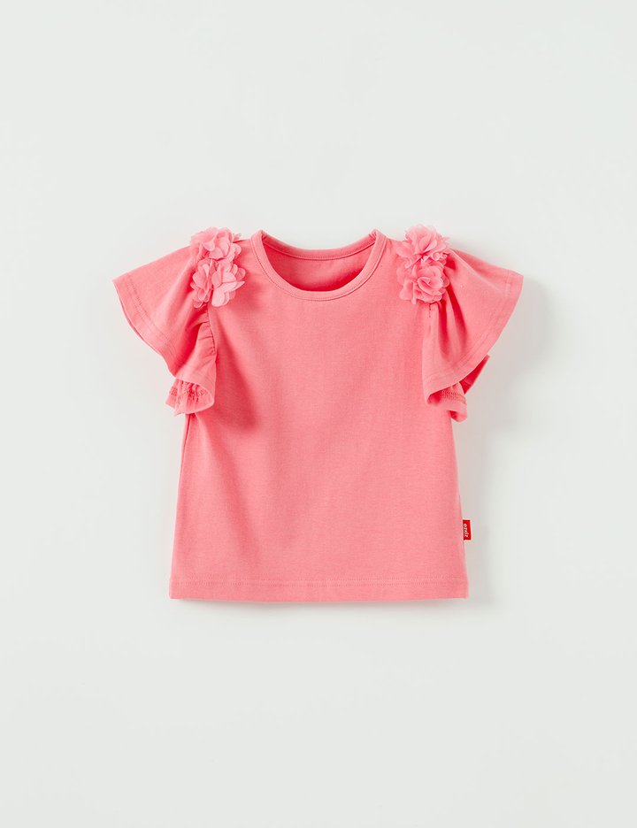 플라워 장식과 소매 플레어가 사랑스러운 티셔츠