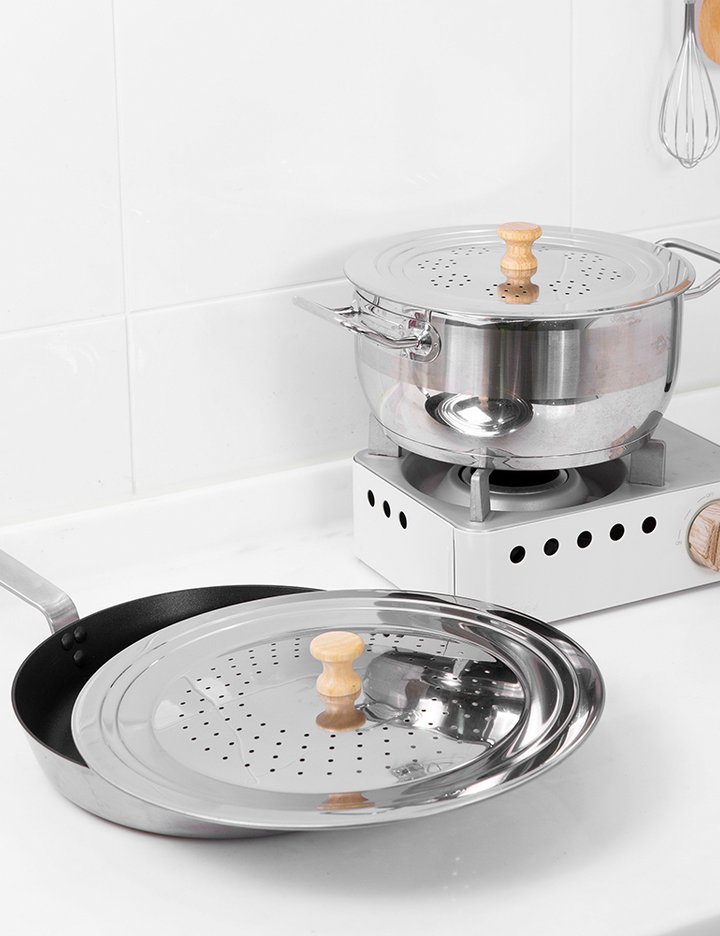 편안한 우드핸들 손잡이와 섬세한 타공 스팀홀로 수분을 골고루 분출시켜 넘침을 방지해주고 튀김이나 구이 조리 시 기름 튀는 걸 방지해줍니다.