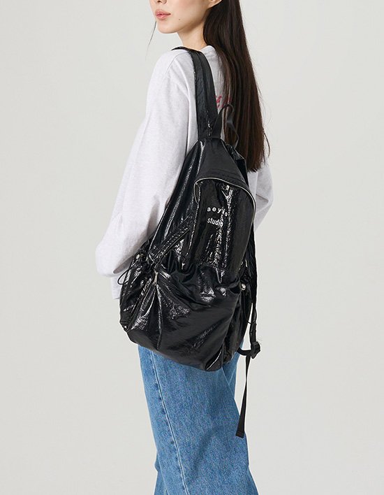 aeyio studio 로고가 프린트된 광택있는 나일론 소재의 백팩