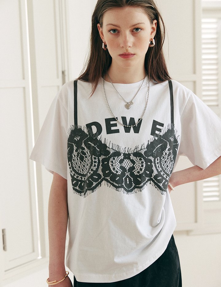 DEW E 레터링 티셔츠와 레이스 뷔스티에를 레이어드해 입은 듯한 유니크한 티셔츠입니다. 고급스러운 코튼 100 소재를 사용해 티셔츠 하나만으로도 완벽한 스타일링이 연출됩니다.