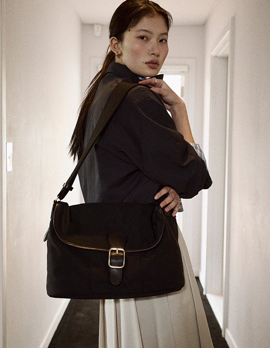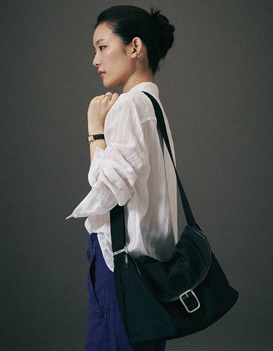 가벼운 나일론 소재에 통가죽 디테일이 더해져 고급스러운 무드의 크로스백