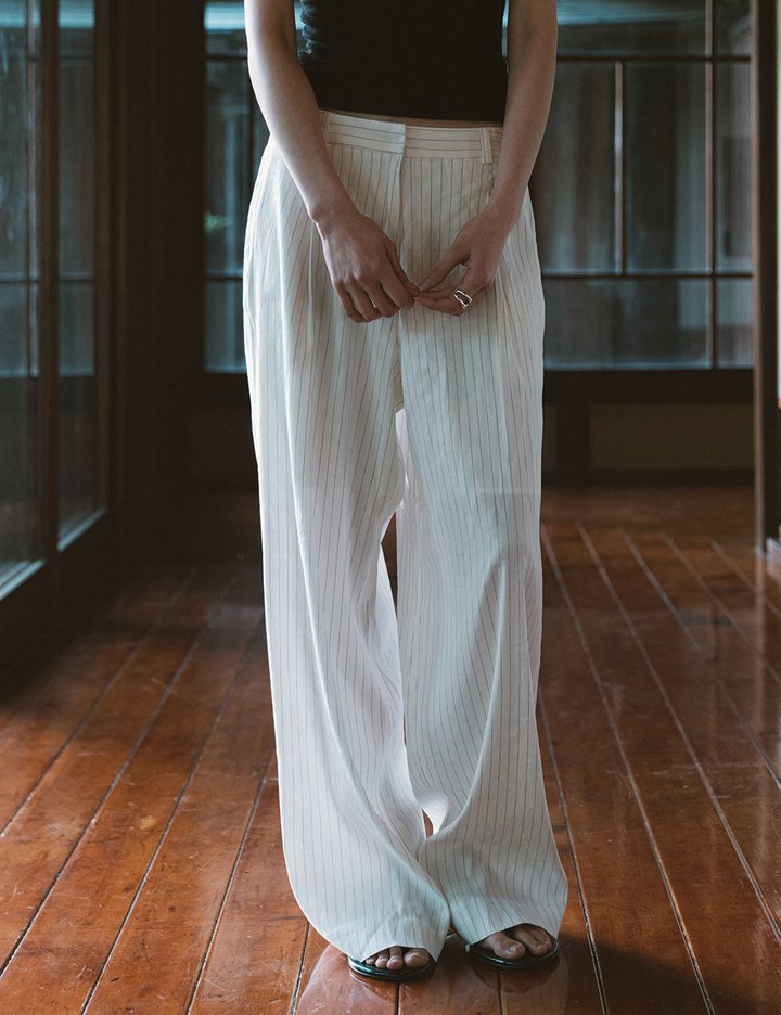 세련된 핀 스트라이프 패턴에 부드럽고 통기성이 뛰어난 여름 슬랙스입니다.