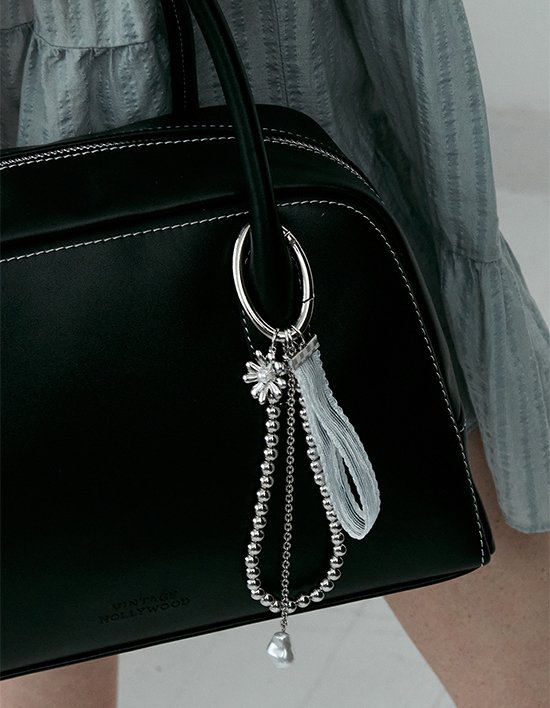네 가지 다른 모티브가 한 번에 조합된 키링으로 길게 떨어지는 체인 끝 진주 모티브가 감각적인 실루엣을 완성하며 유니크한 포인트들을 더해주는 키링