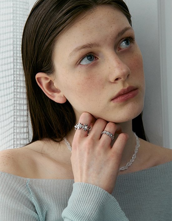 데이지 꽃 형태를 단순화하여 배열한 디자인으로 심플한 쉐입이지만 중앙에 세팅된 장식이 꽃의 싱그러운 무드를 살려주어 화사하게 착용할 수 있는 아이템