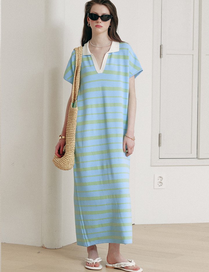 여름에 휘뚜루마뚜루 착용하기 좋은 니트 롱 드레스입니다. 시원한 여름 원사를 사용해 제작되었습니다. 적당한 브이넥 파임과 가오리핏이 늘씬하고 여리여리한 바디라인을 연출해줍니다.