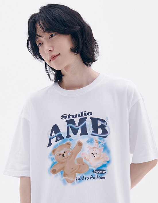 더운 여름 물속으로 다이빙한 곰돌이와 고양이가 물고기를 구경 중인 디자인이 포인트인 반팔 티셔츠