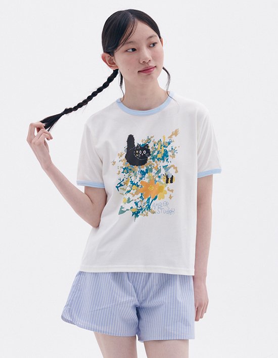 [엠블러] Flower garden 그래픽 세미 크롭 링거 반팔티셔츠 ACR601 아이보리