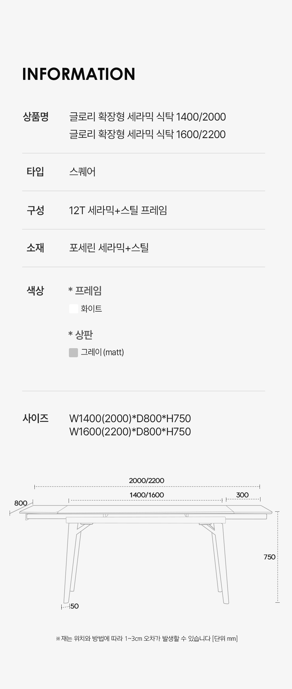 글로리 확장형 세라믹 식탁 테이블 4인용 8인용 그레이 1400/2000