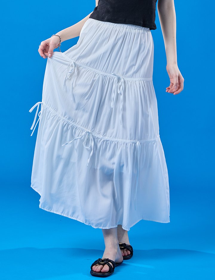 [콜릿] 쿨링 냉장고 밴딩 리본 마몽 주름 플레어 롱스커트 (WHITE) 롱치마 KCL.