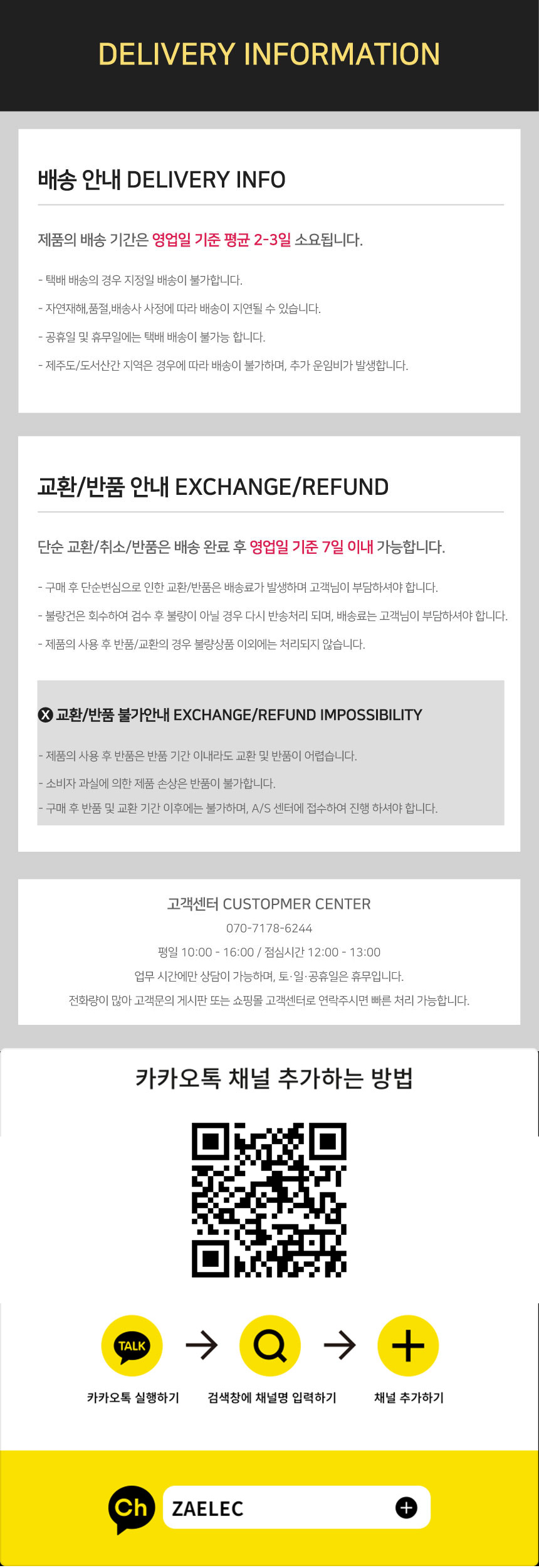 다음에 해당하는 교환·환불 신청은 처리가 어려울 수 있으니 양해 부탁드립니다. 고객님의 책임 있는 사유로 상품이 멸실되거나 훼손된 경우 (단, 상품의 내용을 확인하기 위해 포장 등을 훼손한 경우는 제외)고객님의 사용 또는 일부 소비로 상품의 가치가 감소한 경우시간이 지나 다시 판매하기 곤란할 정도로 상품의 가치가 감소한 경우복제가 가능한 상품의 포장이 훼손된 경우고객님의 주문에 따라 개별적으로 생산되는 상품의 제작이 이미 진행된 경우반품 신청 후 14일 내에 물품이 반환되지 않고 고객님과 연락이 되지 않는 경우