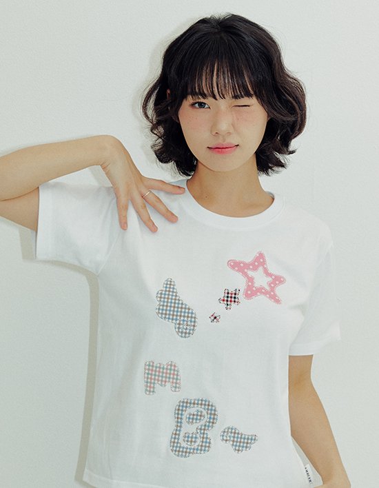 체크패치가 포인트가 되어 키치함이 느껴지는 반팔 티셔츠