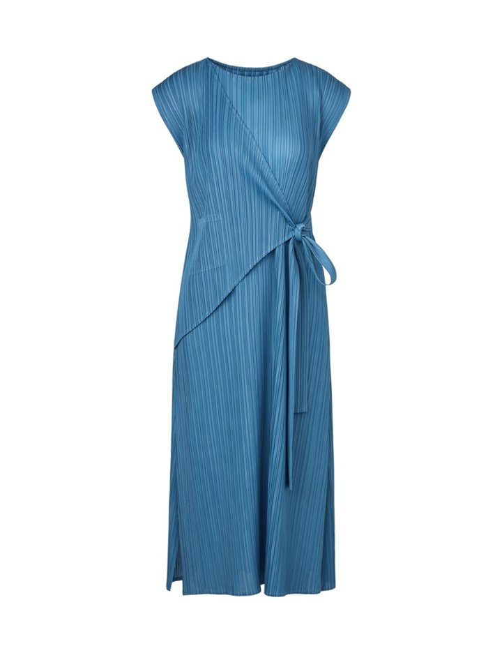 [몽플리쎄] 여성 타이드 랩 스타일 캡소매 플리츠 원피스 (블루)