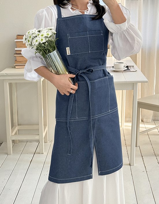 물빠짐 위험이 덜한 논페이드 데님으로 제작한 캐주얼한 디자인의 앞치마