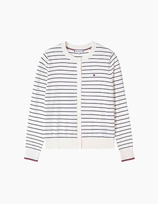 트렌디한 스트라이프 패턴으로 감각적인 스타일을 완성한 크루넥 가디건입니다.<br>라운드넥 디자인이 깔끔하고 클래식한 실루엣을 연출하며, 소매와