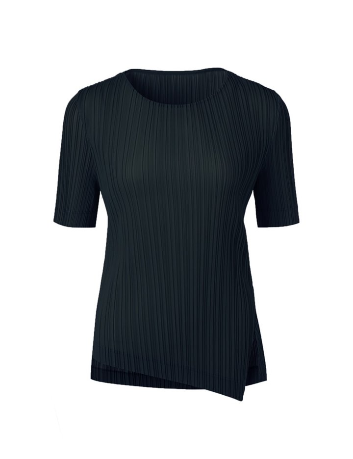 [몽플리쎄] 여성 라운드넥 언발 사선 플리츠 반팔 탑 (다크네이비)