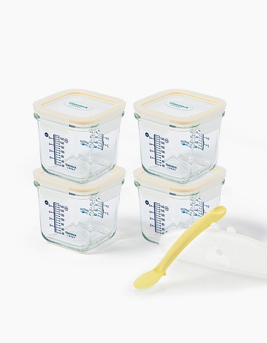 글라스락베이비큰용량눈금이유식용기사면결착캡270ml4조&온도감지실리콘스푼1조세트