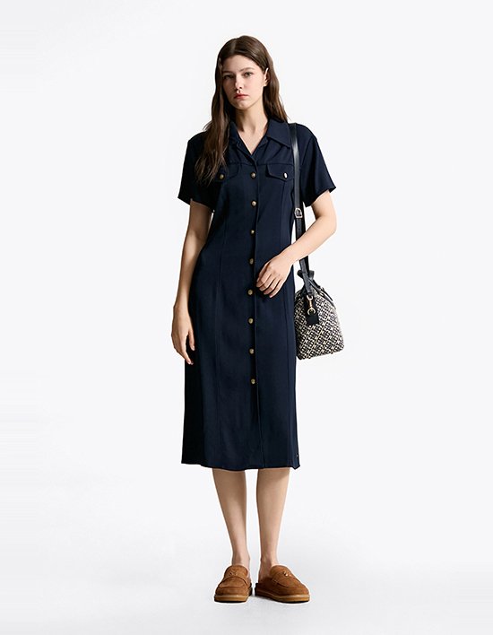 오픈칼라와 하프 슬리브 디자인으로 여름철에도 시원하게 착용할 수 있으며, 플래그 로고가 각인된 골드 버튼이 고급스러운 포인트를 더하는 셔츠 원피