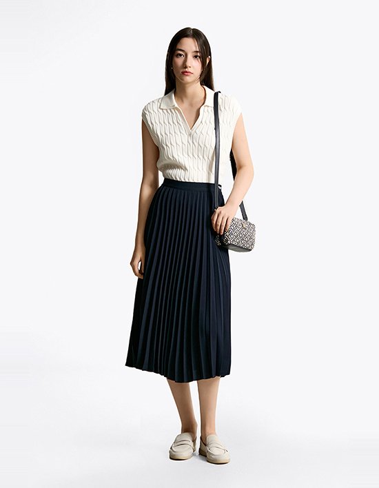 100% 폴리에스터 소재로 제작되어 깔끔하고 세련된 플리츠 디자인을 자랑하는 미디 기장 스커트입니다.허리 밴딩과 HILFIGER 로고가