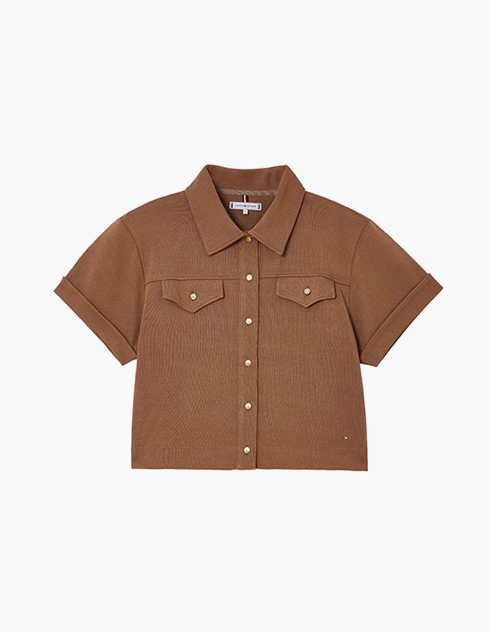 Fit: 레귤러 핏고급스러운 골드 버튼 디테일이 돋보이는 레귤러 핏 저지 셔츠입니다.가볍고 드라이한 터치감의 크레이프 저지