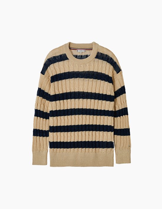 Fit: 릴랙스 핏통기성이 뛰어난 린넨 혼방 소재로 제작된 케이블 니트 스웨터입니다.드라이하고 시원한 터치감을 제공하며,