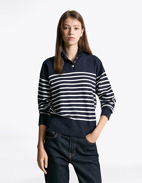 Fit 레귤러 핏탄탄한 밀라노 조직의 코튼 나일론 혼방 소재로 제작된 레귤러 핏 모크넥 스웨터입니다.스트라이프 패턴에 골