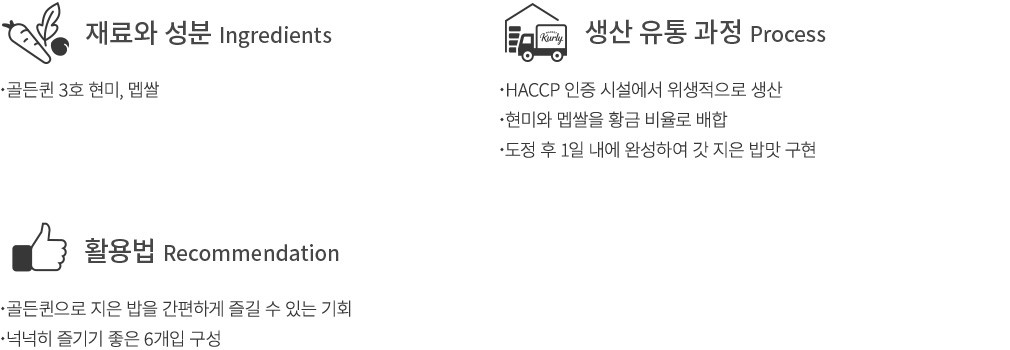 ・골든퀸은 히말라야 야생 벼와 한국의 벼를 교배하여 만든 국산 신품종인데요. 아밀로스 함량이 낮아 찰지고 쫄깃한 식감을 자랑한답니다. 햇반은 쌀을 저온 창고에서 신선하게 보관하여 맛과 향이 살아있는 밥을 만들어요.