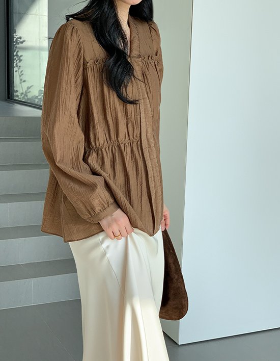 라인을 꽉 조이지는 않지만, 자연스럽게 곡선을 만들어서 체형을 커버하면서도 여성스러운 실루엣이 드러나는 부담 없이 입기 좋으면서도 우아한 분위기를 낼 블라우스 입니다.