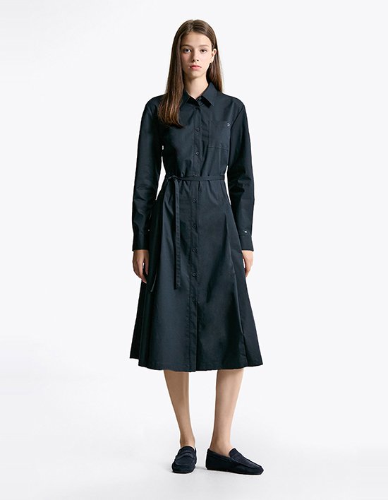 클래식한 셔츠 디자인에 여성스러운 실루엣을 더한 미디 셔츠 원피스입니다.<br>면 혼방 소재로 부드럽고 신축성 있게 착용되며, 허리 다트와 앞