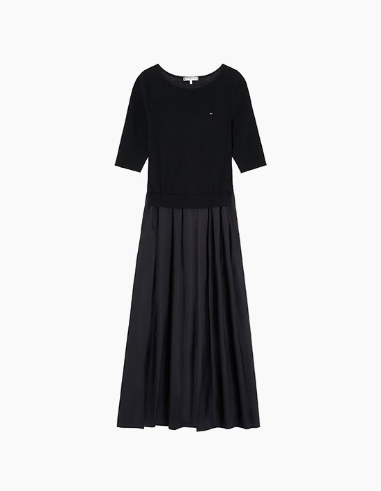 스웨터와 스커트를 하나로 연결한 디자인으로 손쉽게 스타일링이 완성되는 믹스 원피스입니다.상단은 면 폴리에스터 혼방 소재로 간절기에 가볍