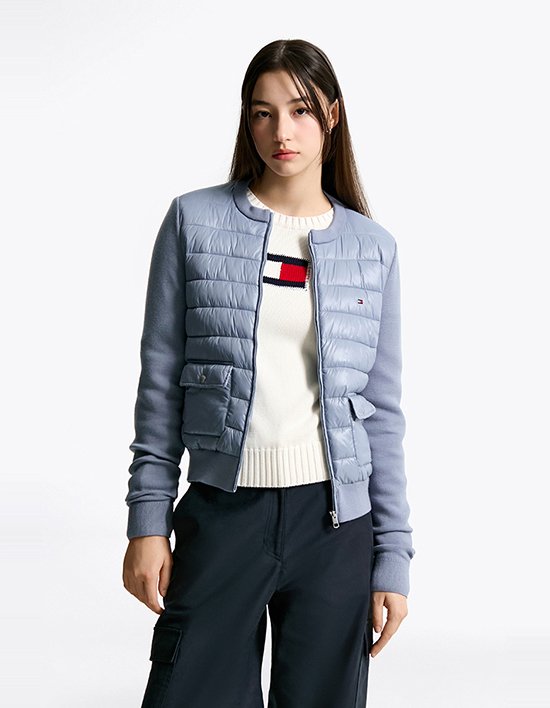 Fit: 레귤러 핏패딩과 니트의 믹스 배색 디자인으로 포근함과 세련된 분위기를 동시에 제공하는 아우터입니다.앞면에는 실용적