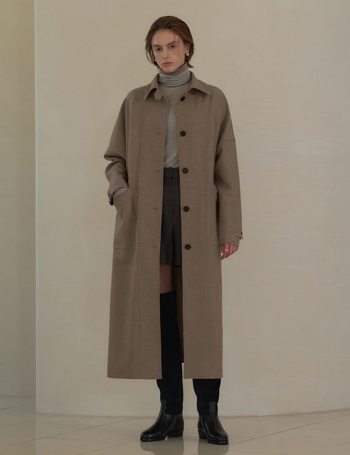 히든 스트링과 드레이프 실루엣이 돋보이는 오버사이즈 트래블 코트로, 간절기 시즌 스타일과 실용성을 모두 갖춘 아이템