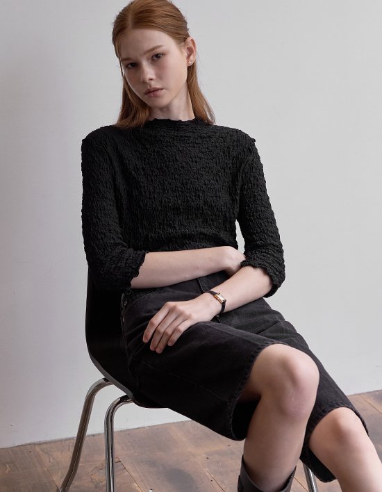 [비뮤즈맨션] 크링클 쓰리쿼터 슬리브탑 블랙