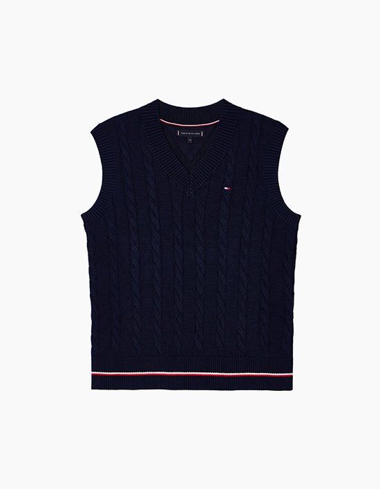 클래식한 케이블 짜임에 몸판 끝단의 글로벌 스트라이프 디테일로 감각적인 포인트를 더한 면 100% 브이넥 니트 베스트입니다.<br>미니 플래그