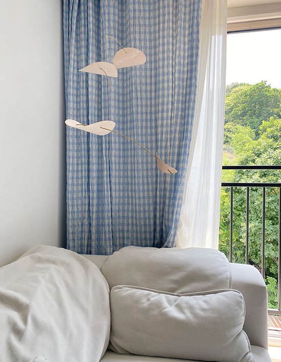 일명 지지미 원단이라고 하는 선염 체크 소재, 컬러감이 우선 시원해 보이는 하늘색이라 하나만 설치해도 청량해 보이는 느낌의 커튼. 표면에 텍스쳐가 살아있어 조금 더 생동감 있어 보이고 조직감이 참 예뻐서 포인트로 사용하기 좋은 커튼.