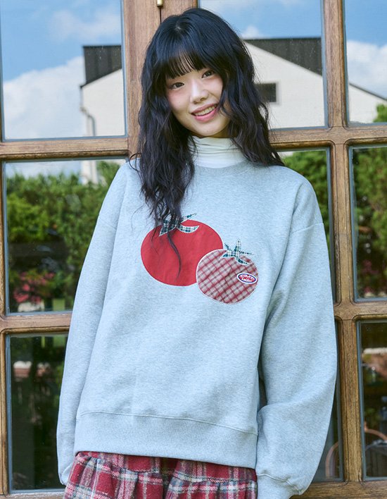 토마토를 체크 패치로 표현하여 빈티지하면서 키치함까지 챙긴 아플리케 자수 맨투맨
