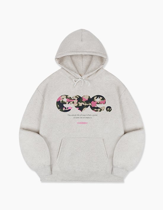 카모플라쥬 속 귀여운 고양이를 찾아보세요! 사랑스러운 색감의 나염으로 키치한 무드를 표현한 후드 티셔츠