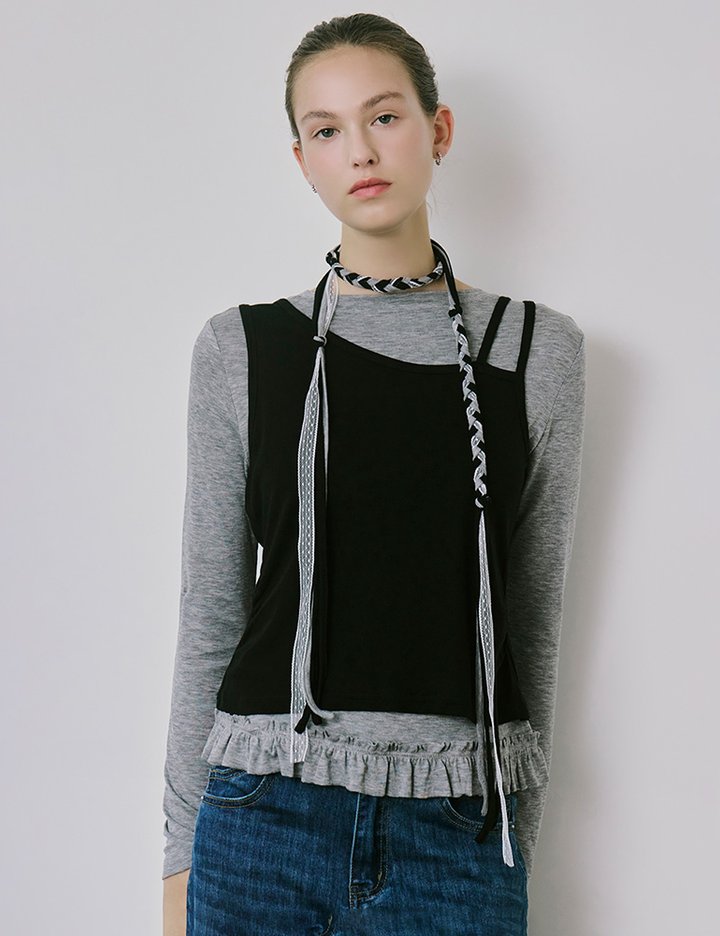 [샤틴] 언발 스트랩 레이어드 티셔츠 O253T571