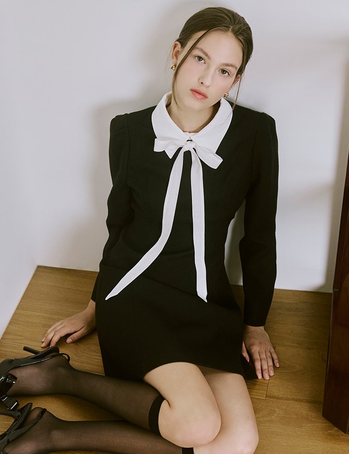 [샤틴] 배색 리본 타이 A라인 원피스 O254T602