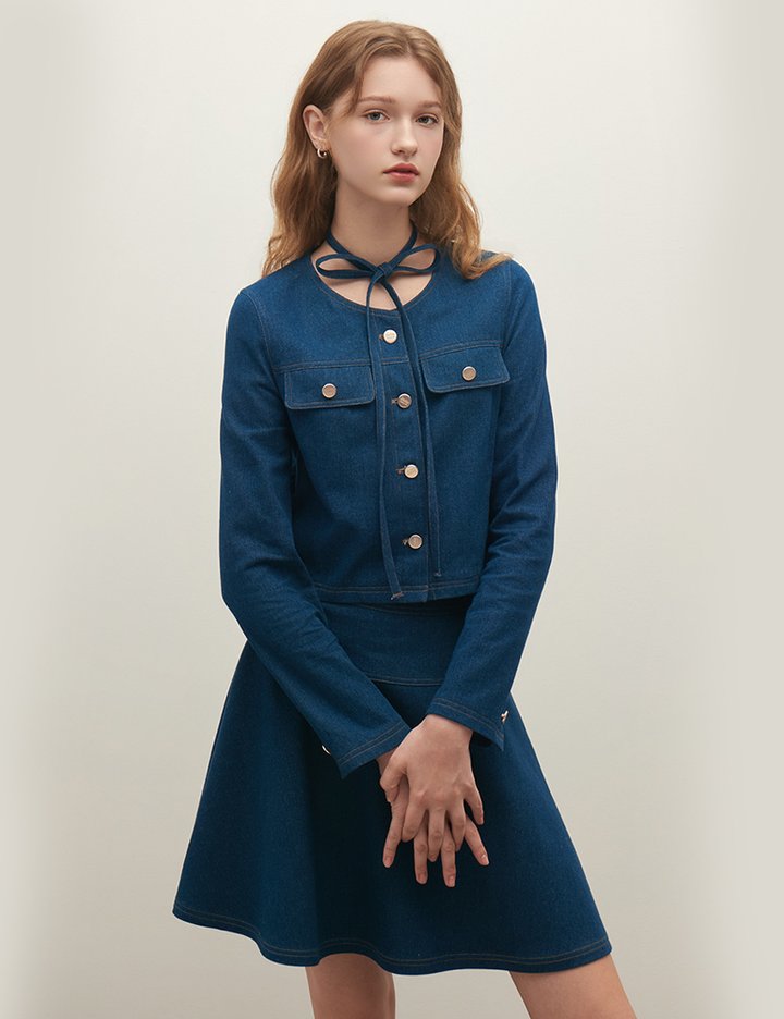 [샤틴] 넥 스트랩 크롭 데님 자켓 O253T101