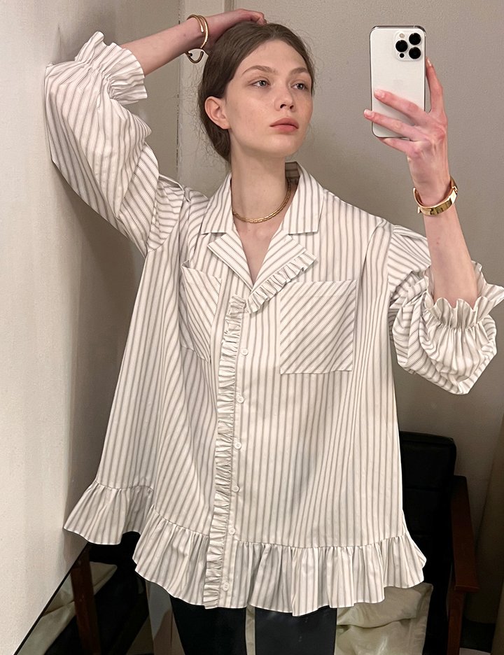 풍성한 벌룬 소매와 프릴 디테일이 로맨틱한 오버핏 셔츠입니다. 소매 끝 밴딩 처리로 자연스럽게 퍼지는 프릴이 우아한 무드를 더해주며, 카라부터 하단까지 이어지는 프릴 라인은 로맨틱한 분위기를 완성합니다.