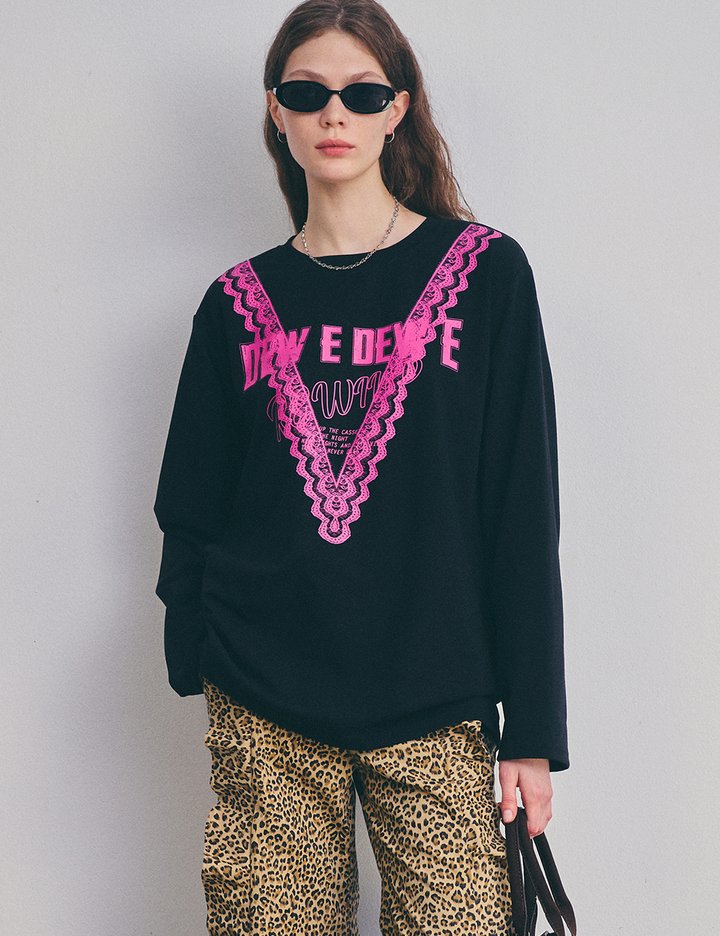 캐주얼한 무드의 디자인에 레이스를 프린트한 러블리함을 믹스한 탑 입니다. 레이스 테이프 실사를 프린트해 실제 레이스를 덧댄 듯한 연출이 매력적입니다.
