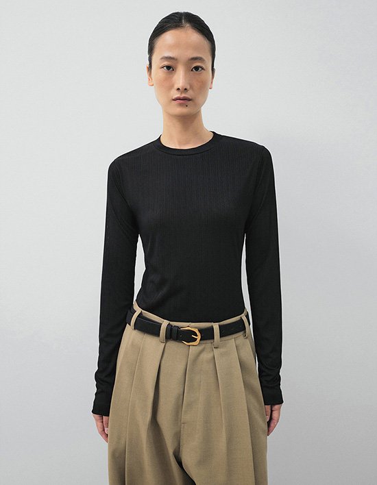 베이직한 라운드넥에 세로 플리츠 주름이 더해진 긴팔 티셔츠