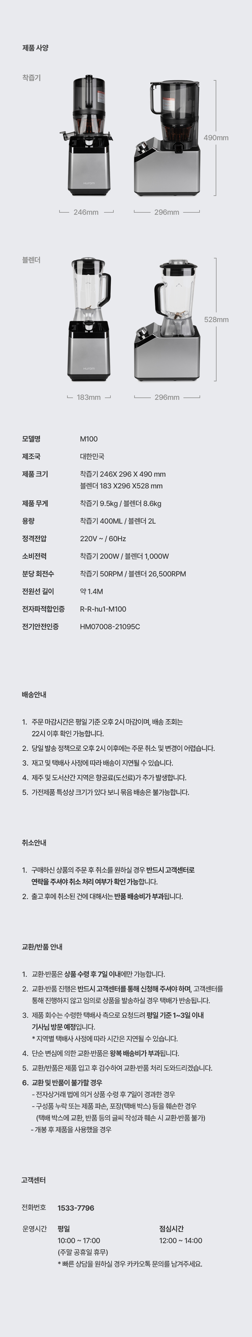 착즙기 : 245(W) x 296(D) x 492(H) mm / 9.5Kg / 블랜더 : 186(W) x 296(D) x 530(H) mm / 8.6Kg