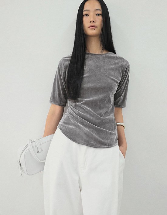 여성스러운 실루엣을 살린 벨벳 뒷 트임 반팔 티셔츠