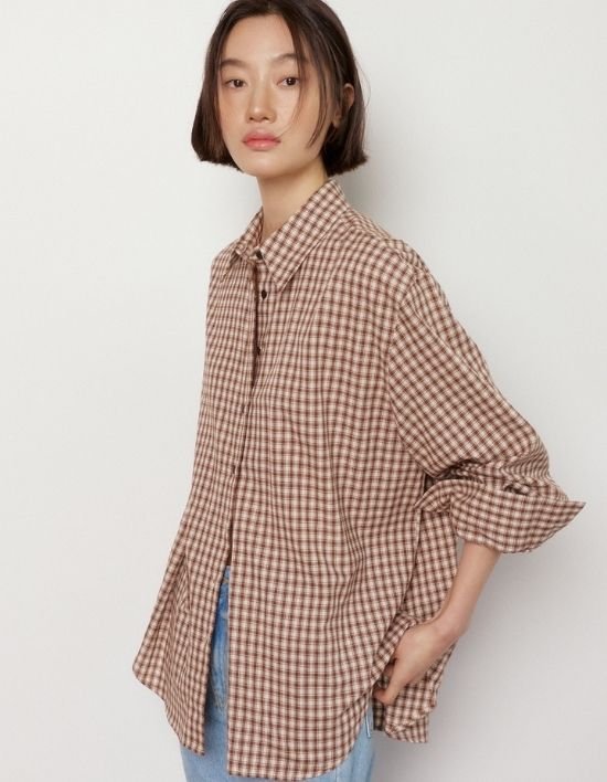 [오쿠카] 체크 오버핏 셔츠 - 브라운