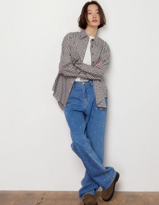 [오쿠카] 체크 오버핏 셔츠 - 네이비