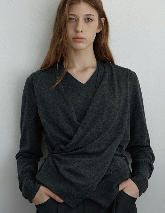파인 게이지의 심플하고 가벼운 울 브이넥 니트 제품입니다. 어깨에 숄 형태로 레이어드 되어있는 편직물로 양 사이드 단추에 드레이프 연출을 할 수 있습니다.