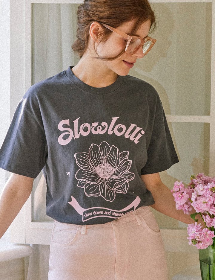 [슬로우롤리] 플라워 리본 티셔츠 - 차콜