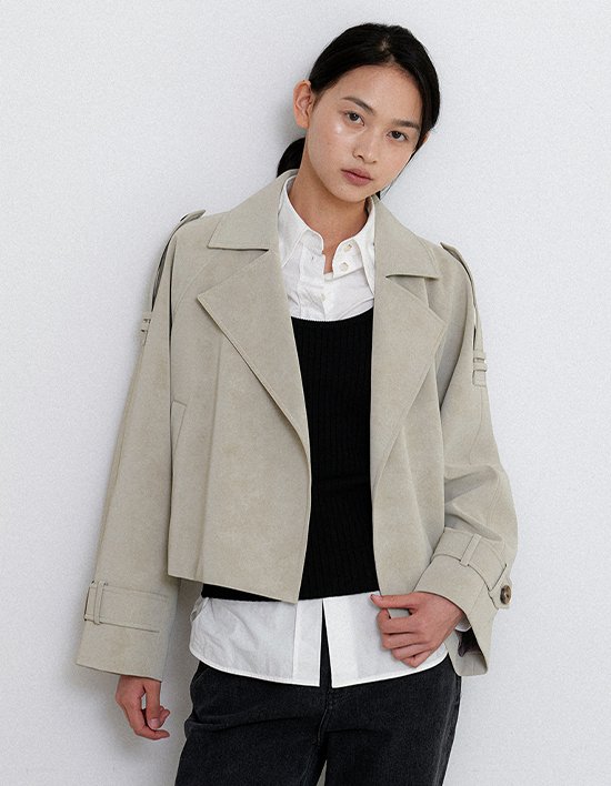스타일리쉬 하고 고급스러운 누벅 소재로 제작된 숏 트렌치 코트.